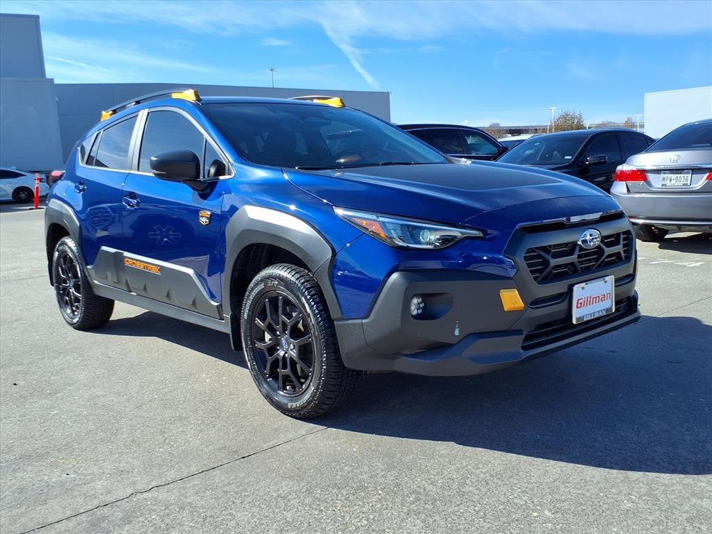 Gillman's Lifetime Engine Warranty lasts as long as you own your vehicle - free with the Gillman Pre-Owned Promise. If the vehicle isn't right for you, return it in purchase condition within 2 days or 200 miles as part of our Happy-Driving Guarantee. (Valid on vehicles under 90,000 miles and less than 7 years old). Experience adventure with this Dark Blue 2025 Subaru Crosstrek Wilderness AWD Crossover, featuring just 9,000 miles on the odometer. Built for the bold, the Wilderness trim includes the powerful 2.5L H4 engine (182hp), 8-speed shiftable CVT, and Subaru's renowned full-time AWD with Hill Descent Assist for rugged capability. Stay connected and safe with wireless Apple CarPlay/Android Auto, a massive 11.6-inch STARLINK touchscreen, adaptive cruise control, lane centering, blind spot detection, rear cross traffic alert, and advanced automatic emergency braking with pedestrian detection. Enjoy heated front seats, dual-zone automatic climate control, push-button start, LED headlights and fog lights, and heated side mirrors. Premium features include a front wireless charging station, leather-wrapped steering wheel, and Wilderness-specific upgrades like splash guards, bumper cover, and rear seatback protector. This Crosstrek is ready for city commutes or weekend trails-don't miss out on this low-mileage, adventure-ready SUV! All vehicles subject to prior sale. We are not responsible for typographical errors and may change information without notice. Photos may not depict the actual vehicle. Tax, title, and license fees not included. Dealer Discount available to all buyers.Vehicles purchased from Gillman Automotive Group include a Bring It Back Guarantee: return the vehicle in purchase condition within two days or 200 miles. New current-model-year vehicles and qualifying pre-owned vehicles (under 90,000 miles and less than 7 years old) are eligible. Guarantee is non-transferable and has no cash value. Lifetime Warranty available on select pre-owned vehicles. See dealer for details; restrictions may apply.